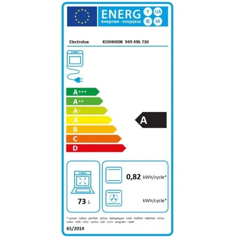 Electrolux KOIHH00K. Dimensione del forno: Media, Tipo di forno: Forno elettrico, Capacità interna forno totale: 73 L. Posizionamento dell’apparecchio: Da incasso, Colore del prodotto: Nero, Tipo di controllo: Manopola. Classe efficienza energetica: A, Consumo energetico (convenzionale): 0,82 kWh, Scala di efficienza energetica: Da A+++ a D. Tipo di lampada: Alogena. Larghezza: 594 mm, Profondità: 568 mm, Altezza: 589 mm