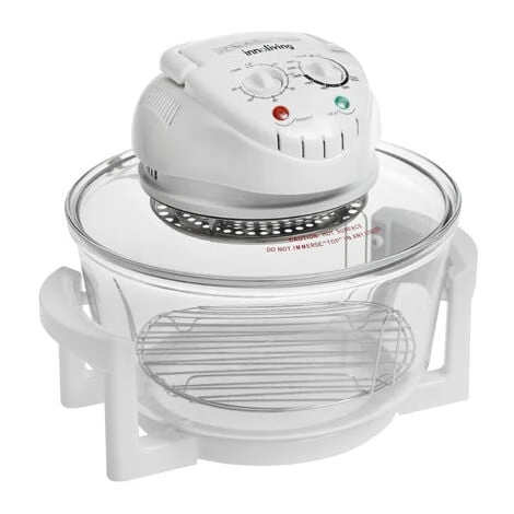 Forno alogeno a convezione: Potenza: 1200-1400W; Contenitore in vetro con capacità 12L; Pannello di controllo sul coperchio; Temperatura cottura da 65°C a 250°C; Timer da 60 minuti; Maniglia di sicurezza; Base con impugnature termoresistenti; Multifunzione per arrostire, scaldare, grigliare, cuocere a vapore, scongelare; Cottura rapida e simultanea di più alimenti; Controllo visivo della cottura degli alimenti; Sistema autopulente; Accessori inclusi: griglia bassa, griglia alta,pinze; Alimen…
