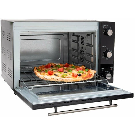 POTENTE MINI FORNO: Capacità: 48 L Potenza: 1800W Dimensioni: 57x45xH37cm. Colore nero. Termostato regolabile da 100 a 230°C. Timer da 0 a 60 minuti con arresto automatico. Diverse modalità di cottura. Accessori: griglia, gocciolatoio, spiedo, manico rimovibile. Forno con un grande volume interno per la cottura veloce di più piatti contemporaneamente. Collegamento a una presa di corrente 220-240V. FUNZIONI: Il forno elettrico offre diverse modalità di cottura: convezione naturale (si riscalda verticalmente) e calore rotante (una ventola distribuisce uniformemente il calore all’interno del forno per una distribuzione rapida e uniforme del calore). Puoi anche selezionare la funzione grill per rosolare i tuoi piatti e la funzione girarrosto per dei bei polli arrostiti! (fornito con lo speciale spiedo da rosticceria). SEMPLICE DA USARE: forno a convezione ultra semplice con 4 pulsanti di selezione della temperatura, 5 modalità di cottura e un timer di 60 minuti; puoi facilmente impostare l’intensità e il tempo di cottura in base alle tue esigenze. Timer con cicalino di fine cottura. Grazie a questo forno, potrete cucinare tutti i tipi di ricette che desiderate: antipasti, carne, pesce, patatine, panini precotti, torte, pizze, gratin, dolci, quiche, salsicce, braciole… CARATTERISTICHE: Questo forno elettrico è dotato di uno sportello a doppio vetro ad alta resistenza che aiuta a mantenere la temperatura e di una cavità antiaderente per facilitare la pulizia. La doppia porta permette di risparmiare energia. La sua spia luminosa e il segnale acustico a fine cottura lo rendono anche facile da usare quotidianamente. Maniglia e manopole in acciaio inossidabile di alta qualità, 4 piedi antiscivolo per un supporto stabile. Pratico forno con una capacità molto grande ACCESSORI INCLUSI: Il forno Kitchen Move viene consegnato con numerosi accessori: una griglia cromata, una leccarda (o piatto smaltato o teglia) e uno spiedo (essenziale per il pollo!), e 2 manici rimovibili (o pinze)